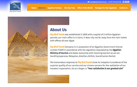 Sky Bird Travel was established in 2005 with a capital of 2 million Egyptian pounds, our main office is in Cairo, in Nas
